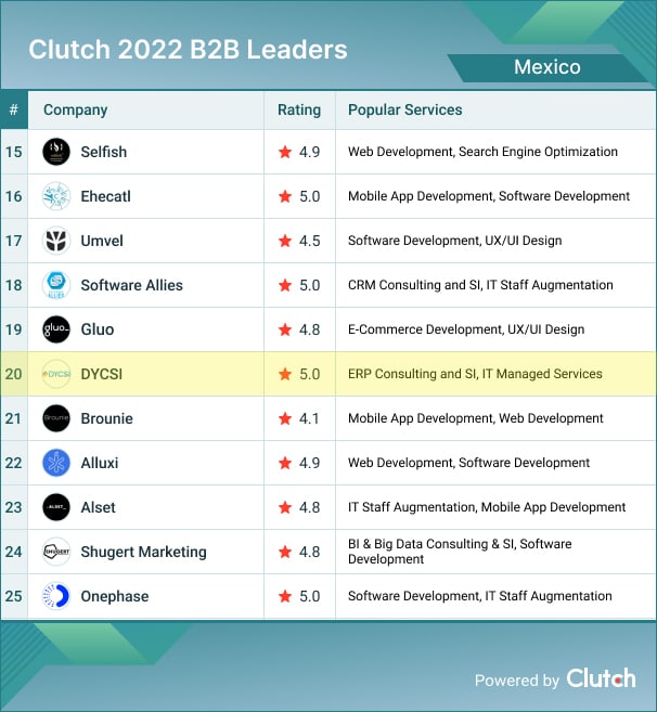 With that in mind, we are incredibly proud to announce that Clutch has recognized DYCSI as one of Mexico’s leading B2B firms in the IT outsourcing space. For context, Clutch is a B2B ratings and reviews platform based in Washington, DC. They evaluate technology service and solutions companies based on the quality of work, thought leadership, and client reviews.
